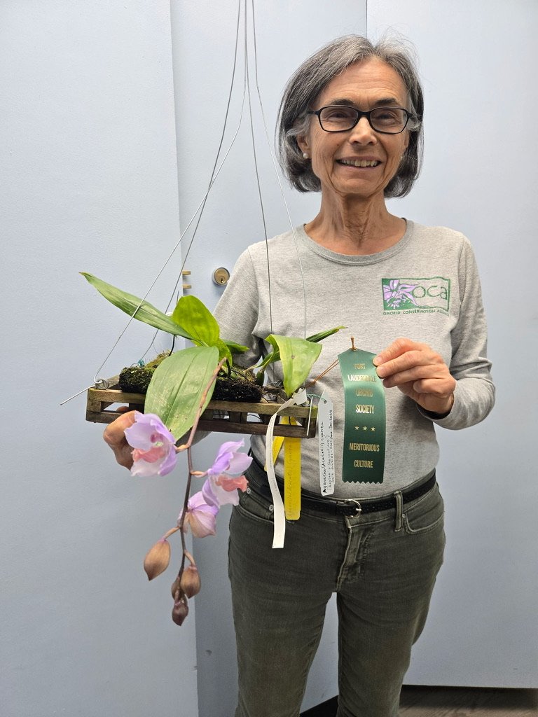 Claire Garrett with a Merititous Culture award from the Fort Lauderdale Orchid Society for her rare Aganisia cyanea orchid